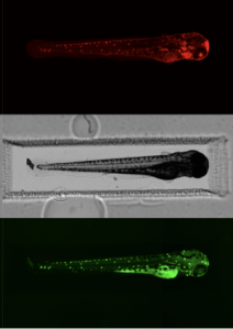 Genetically modifying zebrafish to introduce desired fluorescence markers is an inefficient process, where only a small fraction of the fish properly express the markers. Many embryos go through the genetic modification protocol and the few embryos or larvae that express the markers correctly must be selected for growing and breeding. To make this process more efficient and less laborious, we have built a semi-automated instrument for retrieving/sorting individual zebrafish larvae and embryos. The device can image up to approximately 300 larvae or embryos on a custom array holder to check for the fluorescence markers, and automatically transfer select individual larvae/embryos from the array holder to individual wells on a multi-well plate. This is a collaboration with Adrian Jacobo’s Quantitative Tissue Morphogenesis team. Watch a video on the Fishpicker!