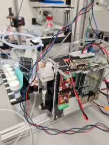 Many long imaging experiments on living cells in multi-well plates require regular media exchanges and/or stimulation with different reagents at different points in time. Doing this by hand is extremely laborious, and often impossible because of tight timing constraints when imaging fast responses of cells to chemical stimuli. To solve this bottleneck, we integrated a robotic system for automatically performing media exchanges and/or stimulation with up to five reagents or media into an existing confocal microscope. This is a collaboration with Manuel Leonetti’s Intracellular Architecture team.