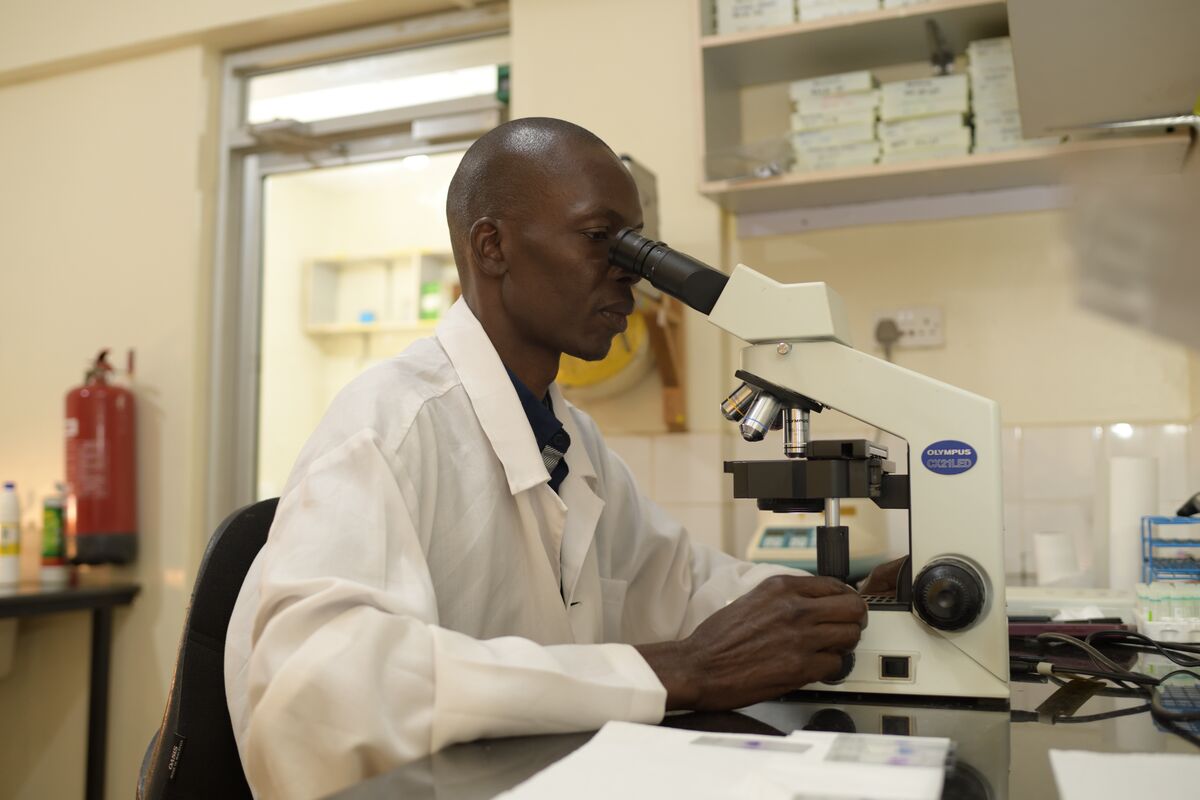 A technician at the Infectious Diseases Research Clinic in Tororo, Uganda demonstrates the conventional method of malaria diagnosis by microscopy. (Credit: Celmo Media)