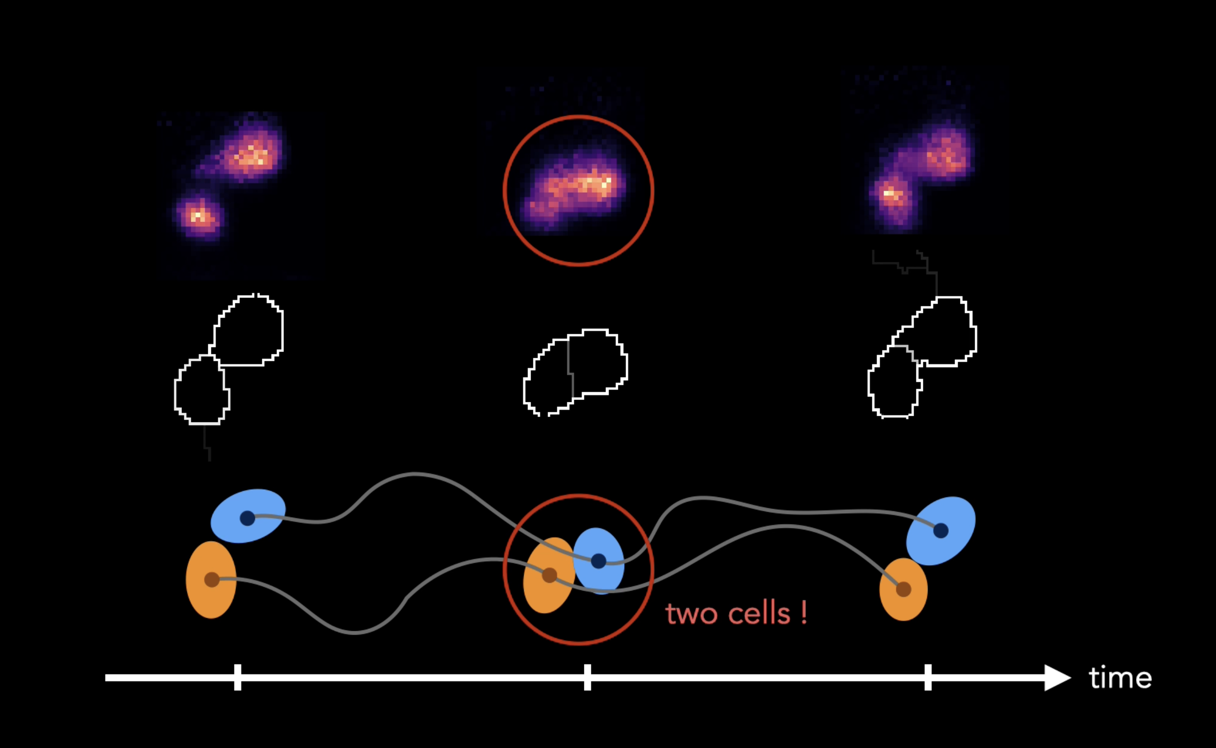 Each time Ultrack inspects a candidate region in a frame, the algorithm constructs something called an ultrametric contour map — a hierarchy of boundaries, with the outlines of the possible cells represented as a composition of coarser to finer partitions. To decide which cell boundary is the correct one, Ultrack considers all frames, deciding on the cell boundaries (segments) which are the most consistent over time when connecting to the neighboring frames (the linking).