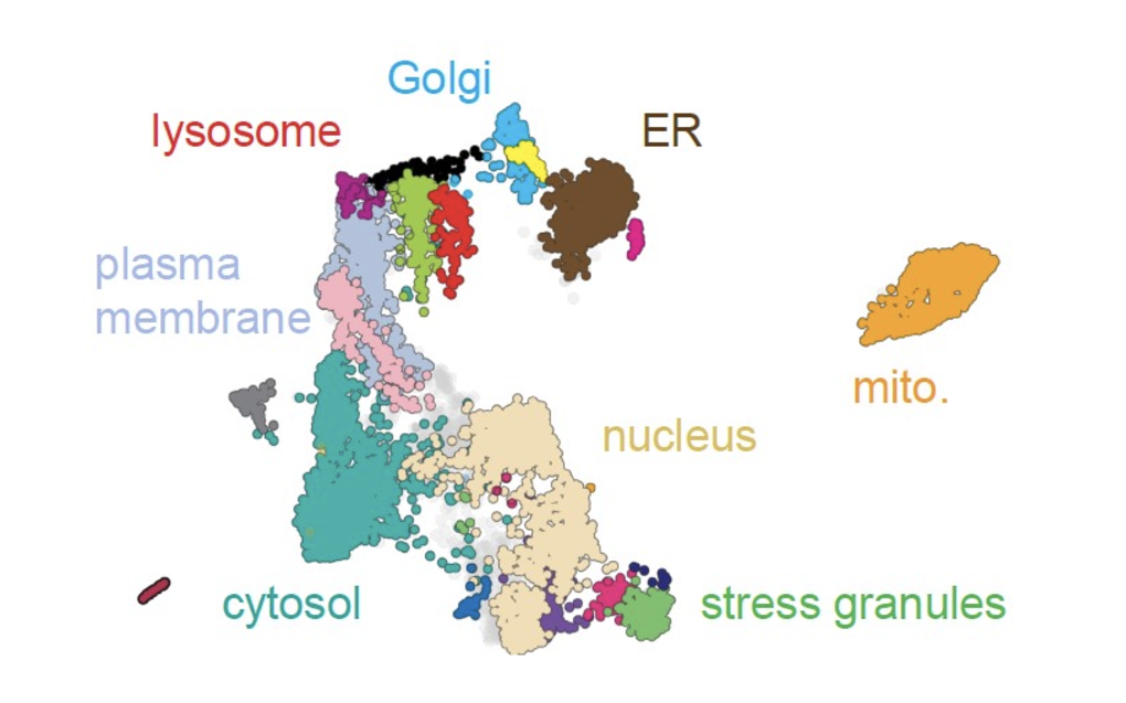 We conduct large-scale studies to profile protein localization across organelles, using an innovative computational approach that enables unprecedented insights into protein dynamics within cells. This groundbreaking technique provides a comprehensive view of subcellular remodeling at the proteome scale in healthy and disease conditions.