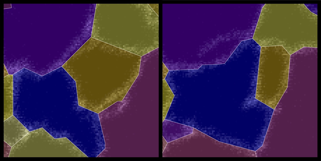 To develop the model, researchers tracked changes in the shapes defined by the tubules. Over the course of 10 seconds (left to right), the blue polygon expands, while the orange one contracts. (While the real ER’s tubules bend and wiggle, researchers found they could successfully model them as straight lines.) (Credit: Laura Westrate)