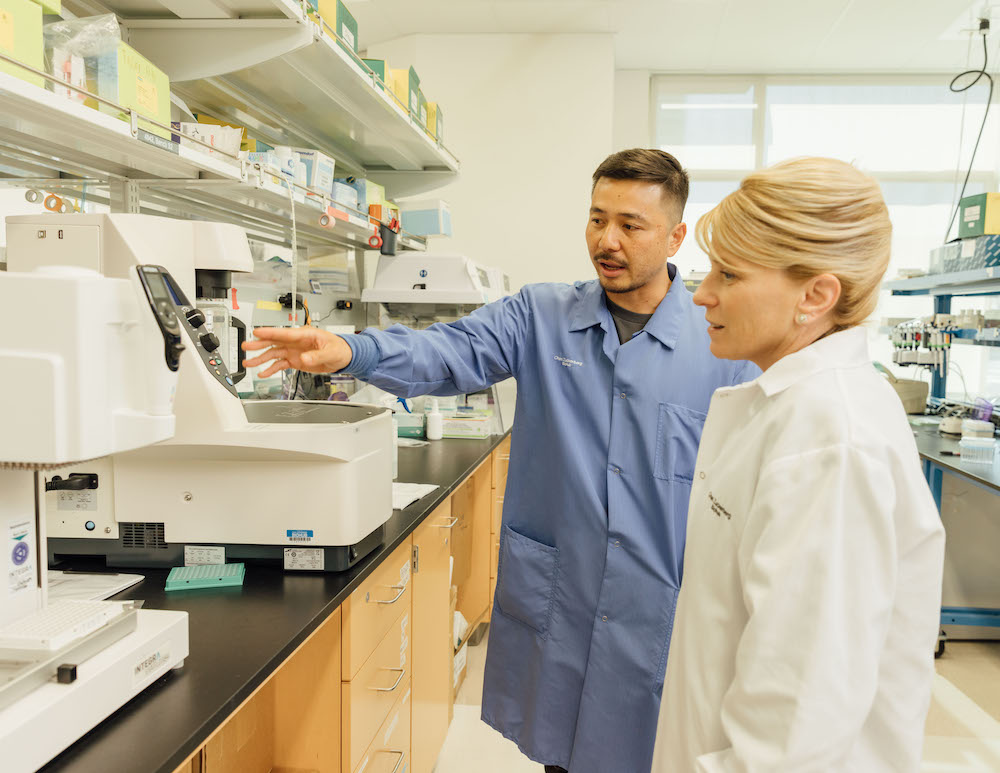 Shana Kelley and Mike Borja of CZ Biohub San Francisco’s Genomics team visit the Genomics lab. (Credit: Dale Ramos, CZI)