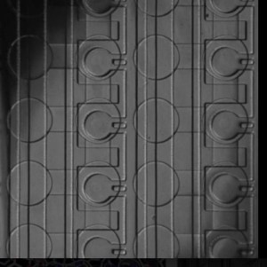 The device is a network of channels formed in two slabs of a polymer stacked on top of each other. Pneumatic valves form where channels cross each other in different layers: pressurizing the top channel deflects a membrane to restrict flow in the bottom channel (just like stepping on a garden hose), an application of the “Quake valve” technology originally developed in the Stanford lab of CZ Biohub Co-President Steve Quake. (Courtesy of P. Fordyce)