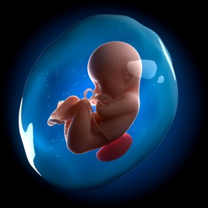 In this computer rendering, the fetus is seen in the amniotic sac, surrounded by the fluid sampled for amniocentesis.