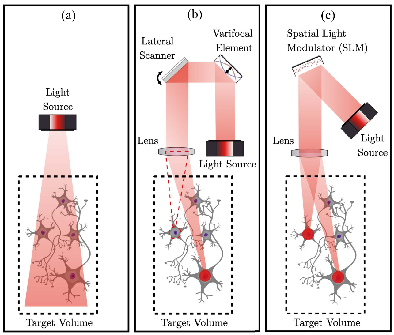 Three all-optical neural interface schemes: in (a) direct illumination with no scanning elements does not have single-cell specificity; in (b) lateral and varifocal elements can target light in 3D but reach only one cell at a time; in (c) a holographic system uses spatial light modulators to project to multiple neurons at a time with single-cell precision. (From Yalcin et al., IEEE J. Solid-State Circuits, 2022)