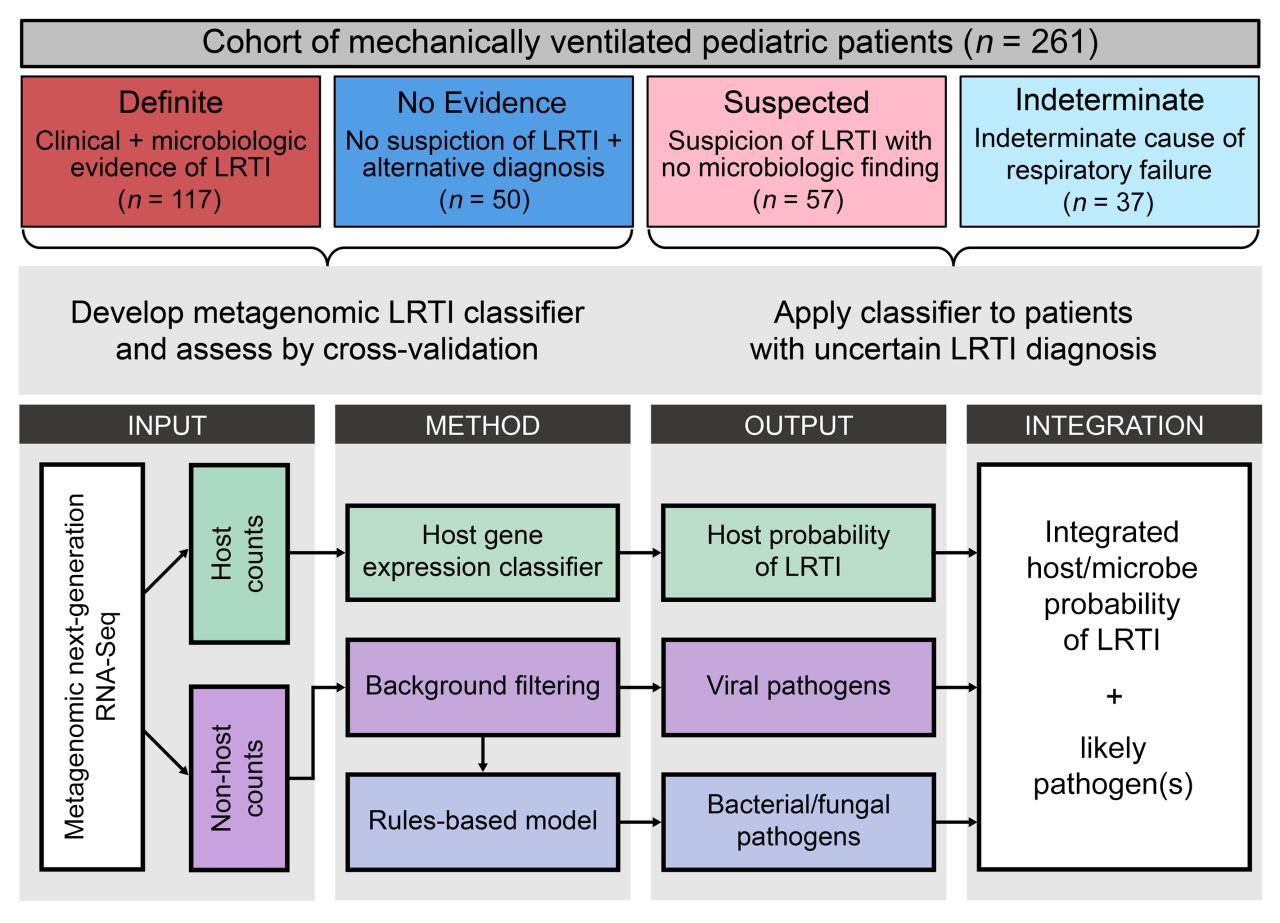 Data from patients characterized as definitely suffering from LRTI and from patients having no evidence of LRTI were used to develop and then test the metagenomic diagnostic. In addition to making a diagnosis, the method also nominates the likeliest causal pathogen for the patients that are classified as infected.